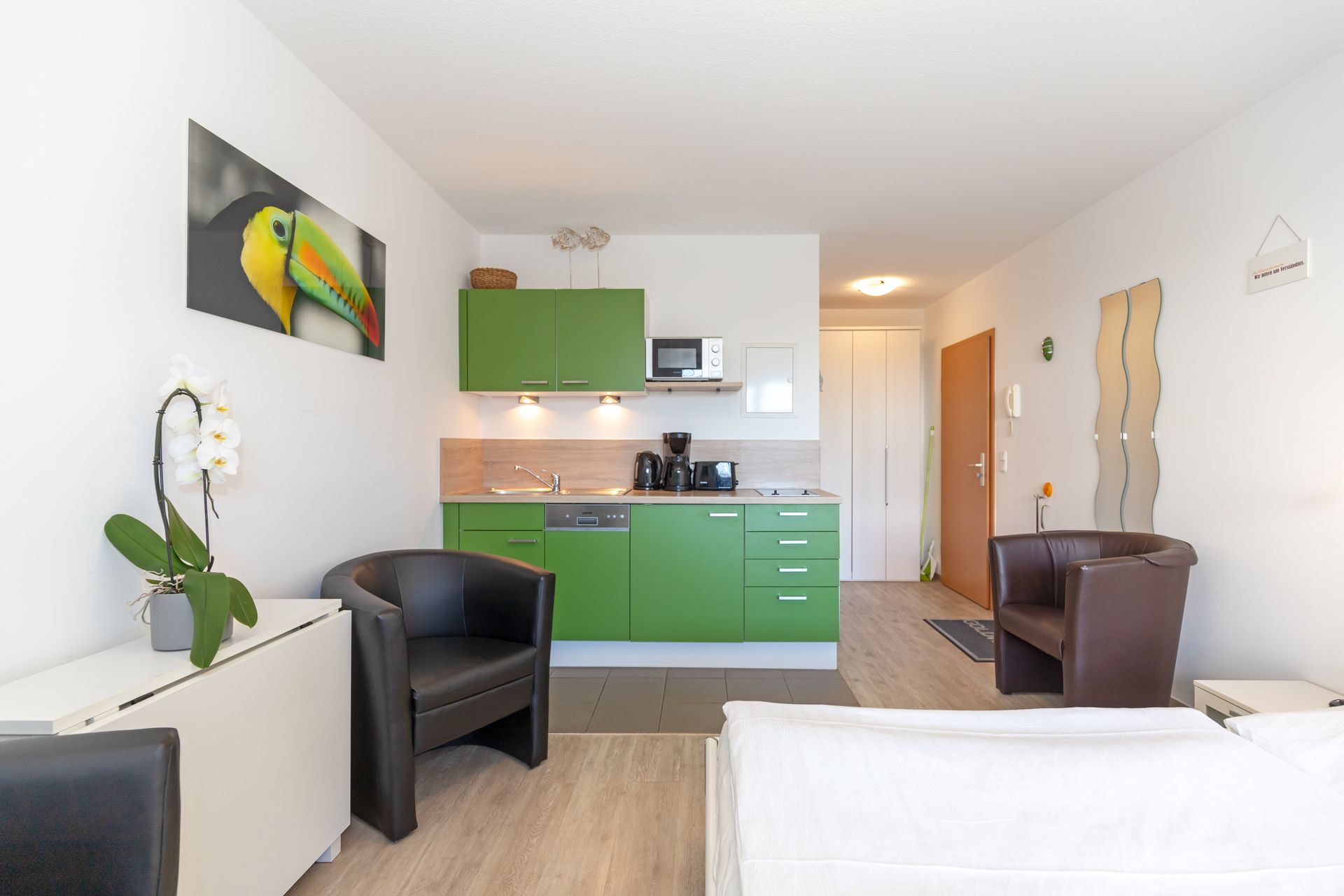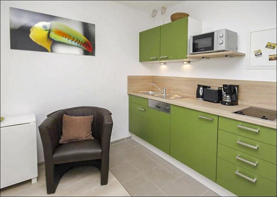 • Wohnküche mit Mikrowelle, zwei Kochplatten und Geschirrspüler