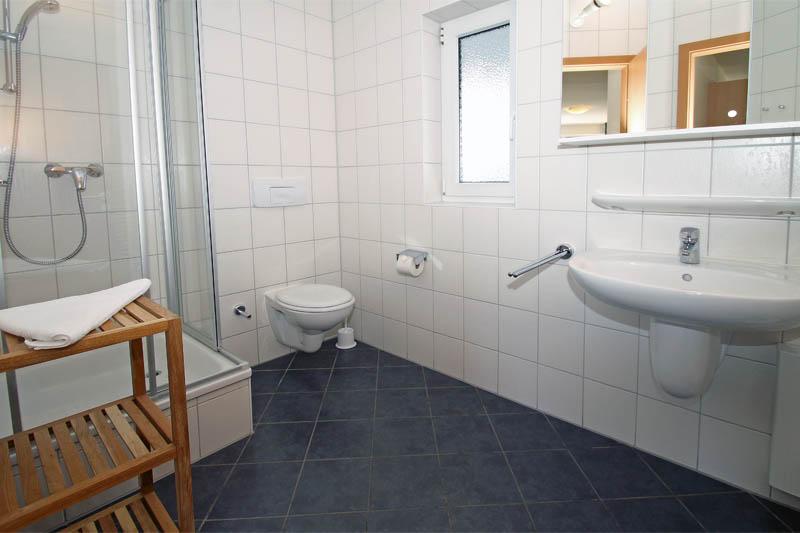 • Bad mit Dusche mit Fenster, WC, Handtuchheizkörper, Föhn